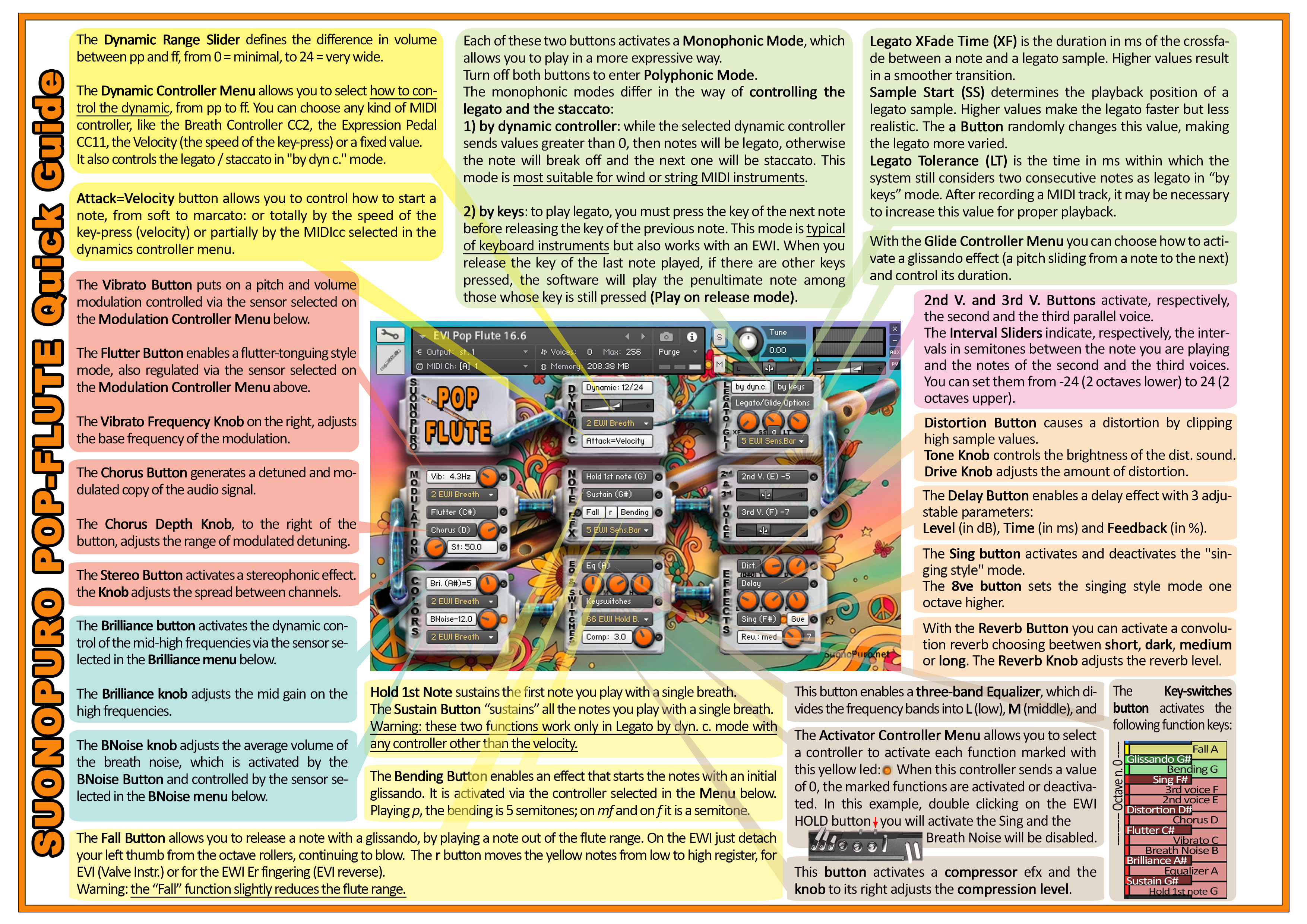With the Pop-Flute you can start a note with a wide range of nuances, from portato to accented, or with bending. You can perform both legato phrases and glissato passages, up to twelfth intervals (19 semitones of distance), with great realism. It also has a wide dynamic and tonal range, adjustable and controllable in many ways, and an incredible five and a half octave range. The crescendo and diminuendo are very natural, without earing overlapping notes.