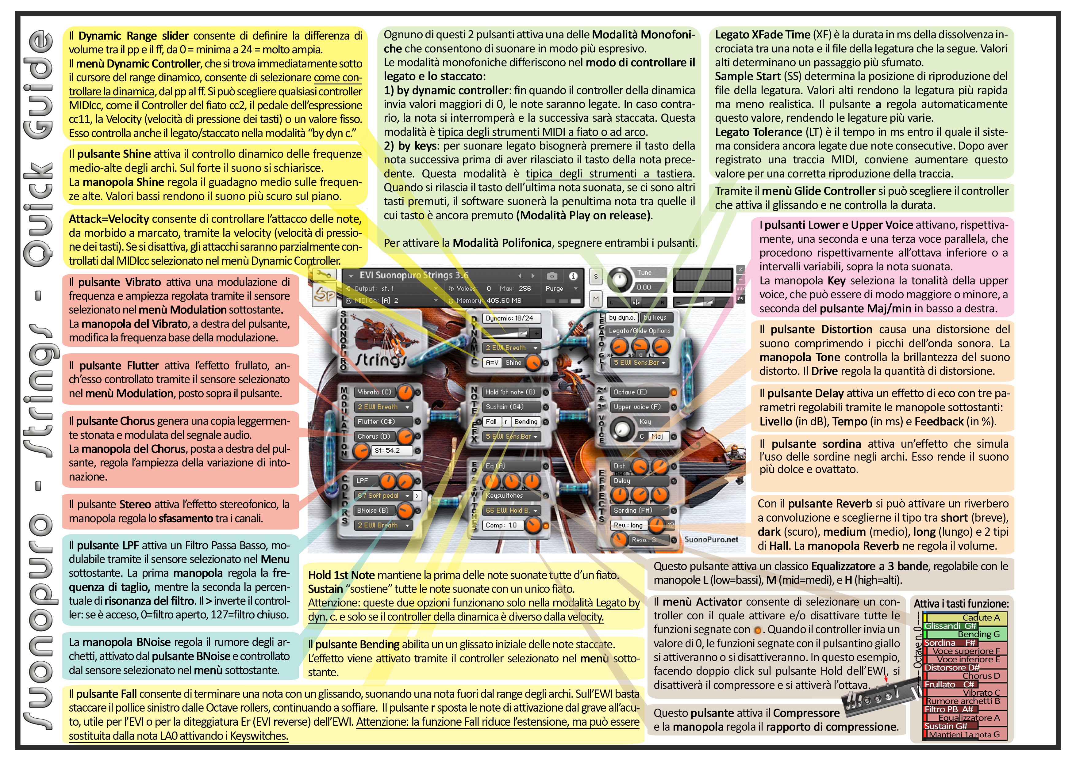 Suonopuro Strings vanta inoltre una vasta gamma di effetti: filtro passa basso, chorus, distorsore, rumore degli archetti regolabile, vibrato automatico, frullato, effetto stereofonico, effetto sordina e molto altro ancora.